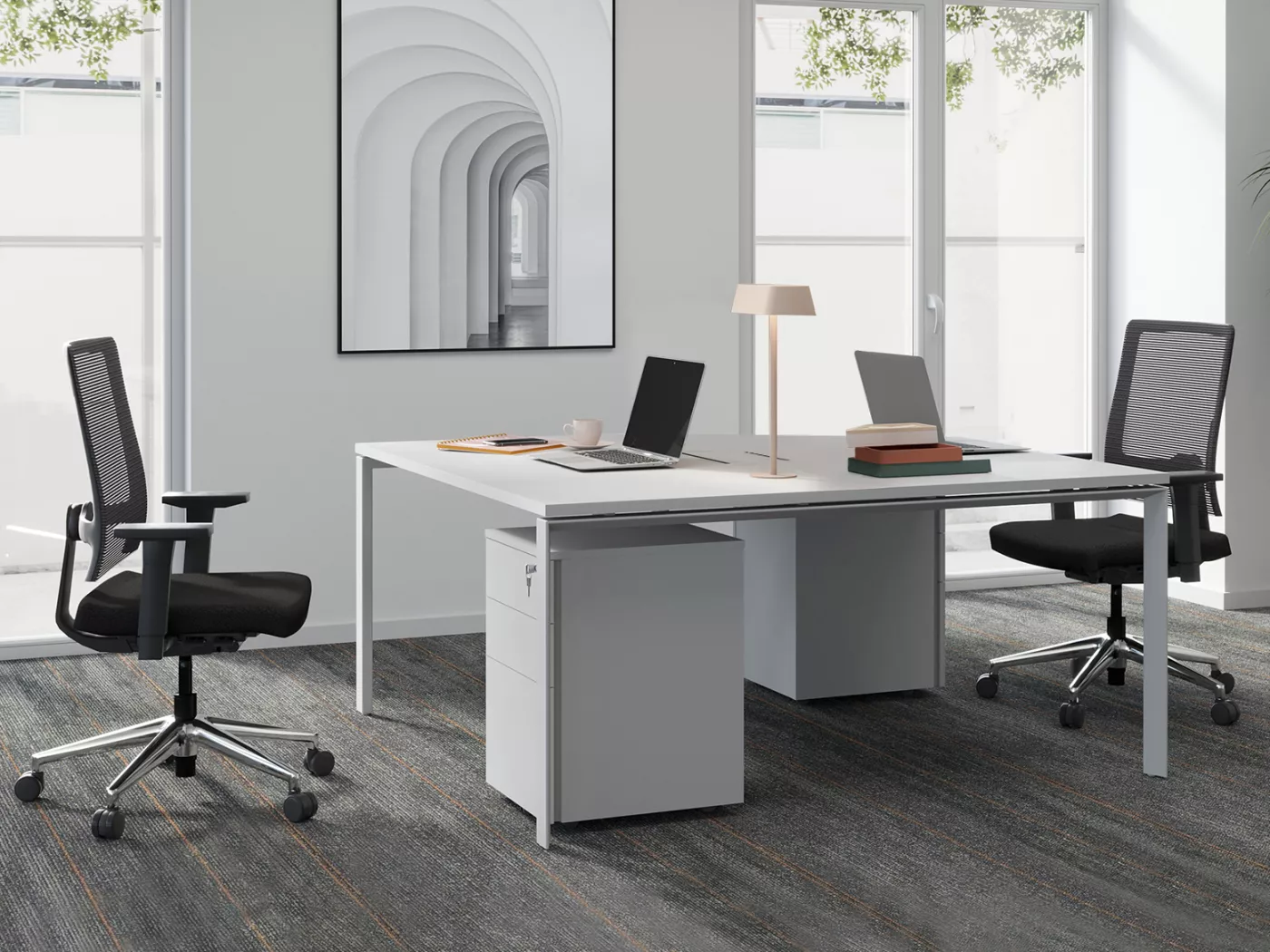 Un bon éclairage est essentiel dans un bureau professionnel en ambiance corporate. Les bureaux peuvent être équipés de luminaires suspendus, de lampes de bureau individuelles et de fenêtres laissant entrer la lumière naturelle.